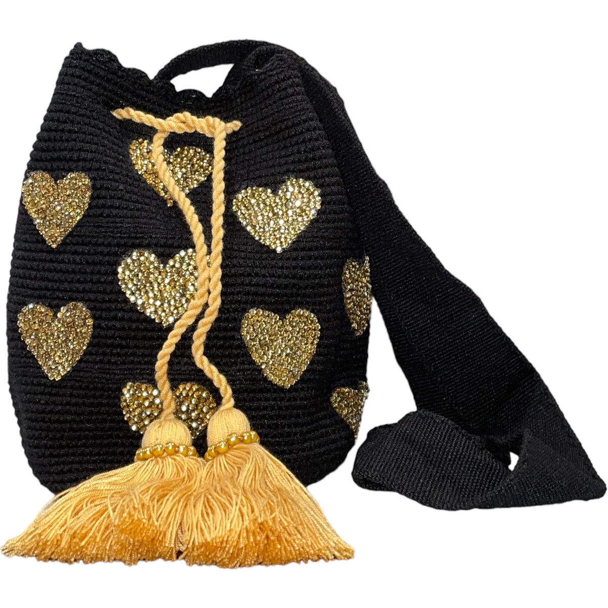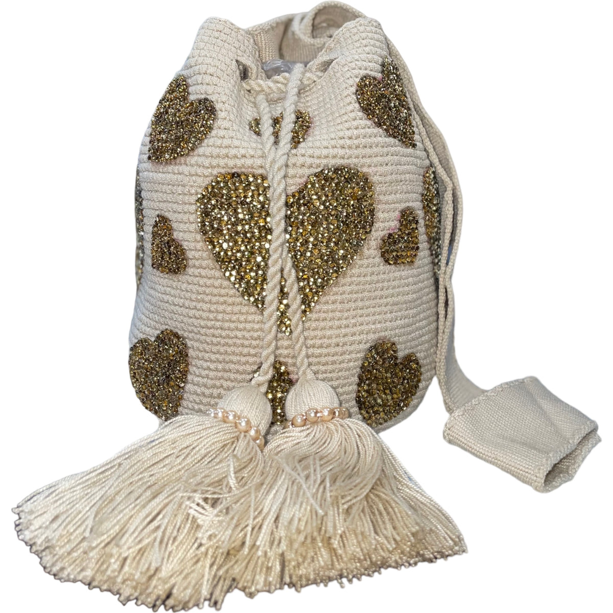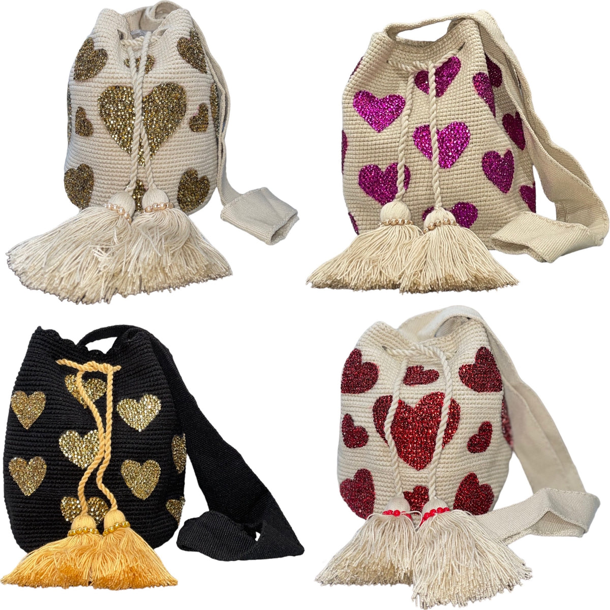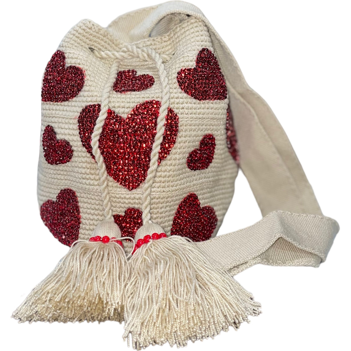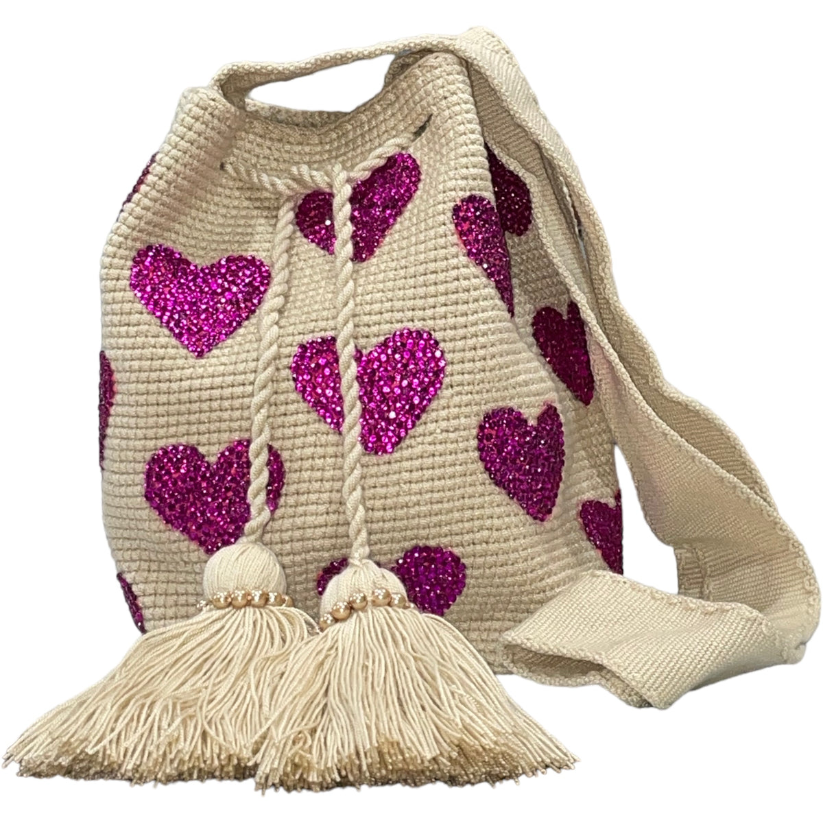 Medium traditional crochet Wayuu bag, embellished with bedazzled hearts that enhanced the artistry of the crochet work.