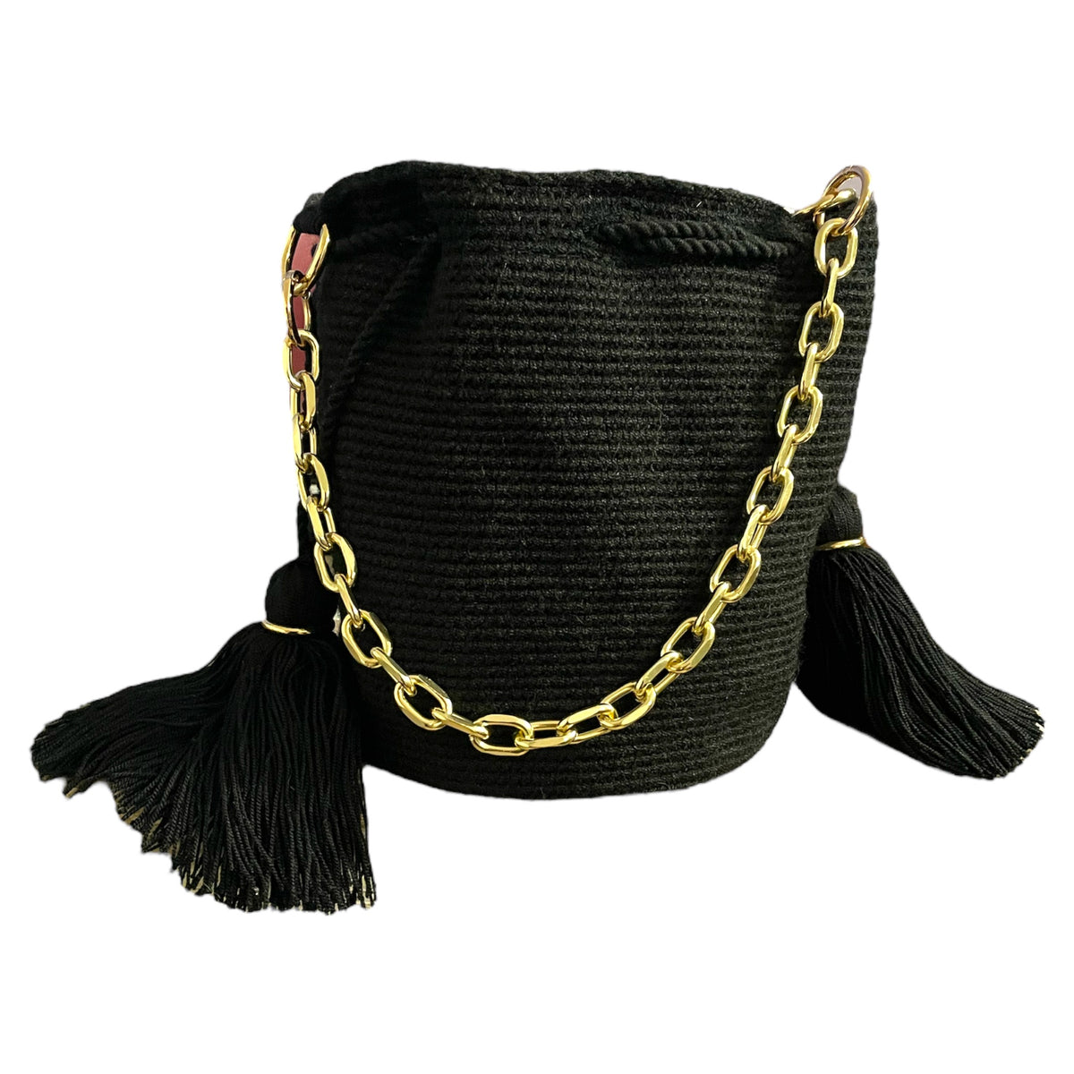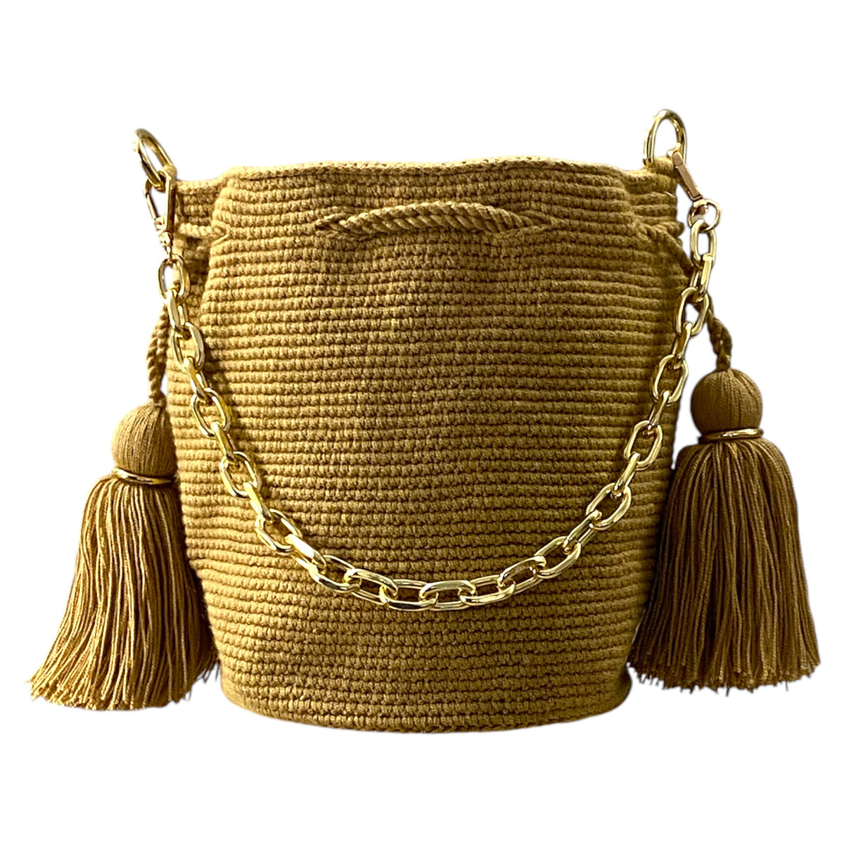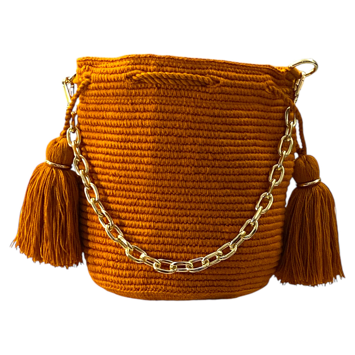 Medium traditional crochet Wayuu bag, embellished with chain-like handle and optional hanging strap. The Gold elements and tassels enhanced the artistry of the crochet work.