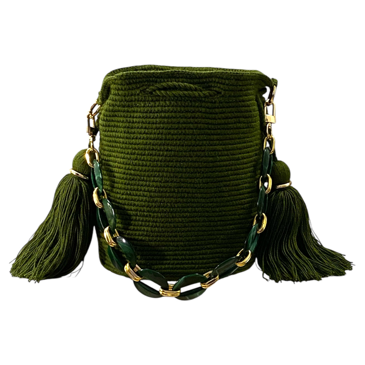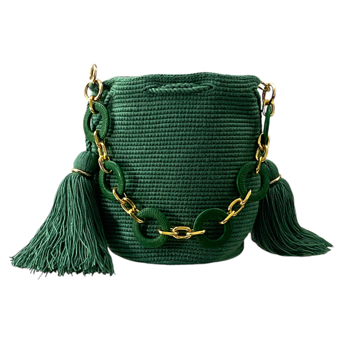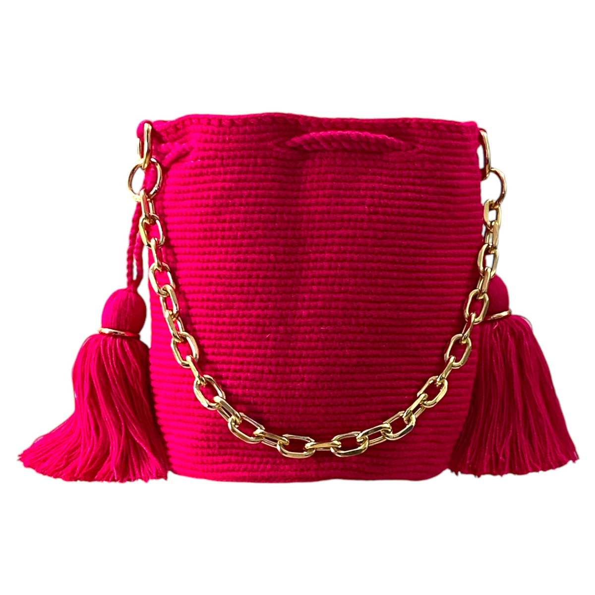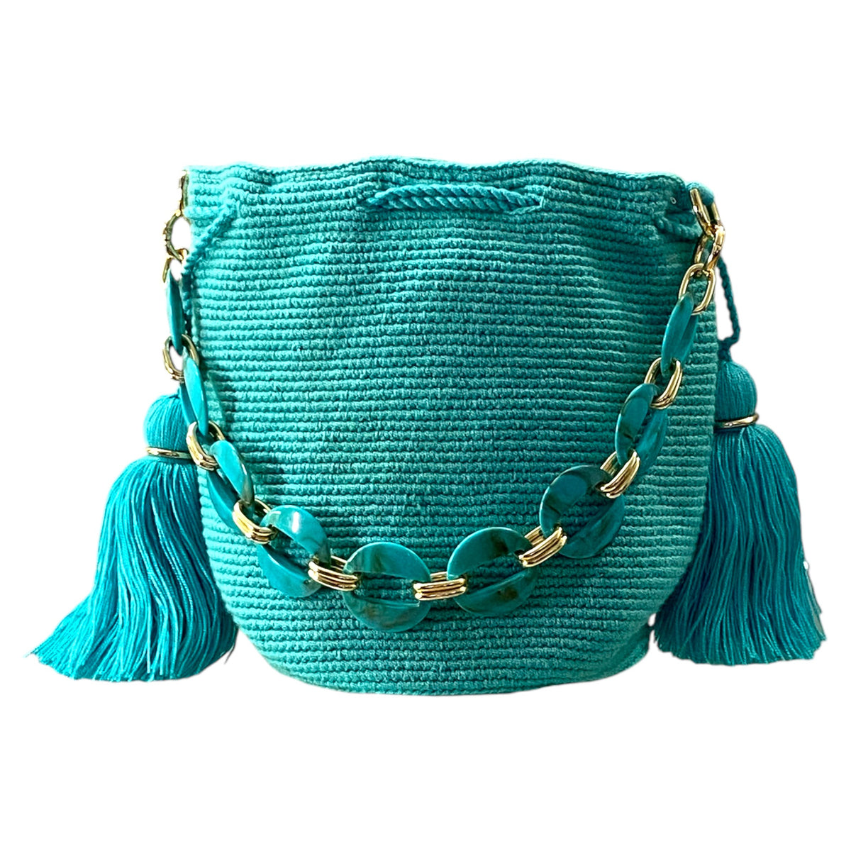 Medium traditional crochet Wayuu bag, embellished with chain-like handle and optional hanging strap. The Gold elements and tassels enhanced the artistry of the crochet work.